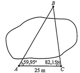 Để đo khoảng cách từ vị trí \(A\) đến vị trí \(B\) ở hai bên bờ một cái ao, bạn An đi dọc bờ ao từ vị trí \(A\) đến vị trí \(C\) và tiến hành đo các góc \(BAC,BCA\). Biết \(AC = 25\;m\); \(\widehat {BAC} = 59,95^\circ \); \(\widehat {BCA} = 82,15^\circ \) (hình vẽ bên). Hỏi khoảng cách từ vị trí \(A\) đến vị trí \(B\) là bao nhiêu mét (nhập đáp án vào ô trống, làm tròn kết quả đến hàng đơn vị)?