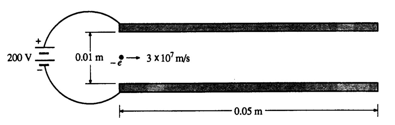 Một cặp tấm dẫn điện vuông song song, có các cạnh dài 0,05m cách nhau 0,01m và được kết nối với nguồn điện 200V, như minh họa sau. Một electron đang chuyển động theo phương ngang với tốc độ 3.107 m/s khi nó đi vào vùng giữa các tấm. Bỏ qua lực hấp dẫn và sự biến dạng của điện trường xung quanh các cạnh của các tấm.