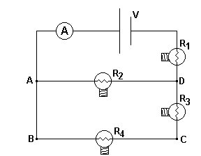 Mạch điện được minh họa có một ampe kế lý tưởng có điện trở bằng không và bốn bóng đèn có điện trở giống hệt nhau được bật sáng ban đầu. Một người tháo bóng đèn R4 ra khỏi ổ cắm, do đó ngắt mạch điện tại điểm đó. Câu nào sau đây là đúng về mạch điện sau khi tháo bóng đèn?