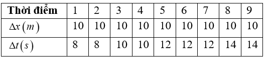 Chọn câu sai. Một người đi bộ trên một con đường thẳng. Cứ đi được 10m thì người đó lại nhìn đồng hồ và đo khoảng thời gian đã đi. Kết quả đo được ghi trong bảng sau: