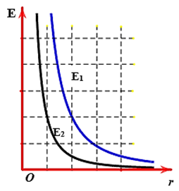 Đồ thị dưới đây biểu diễn sự phụ thuộc của độ lớn cường độ điện trường E (do điện tích điểm gây ra) theo khoảng cách r (đến điện tích) khi điện tích lần lượt được đặt vào hai chất điện môi khác nhau. Xác định tỉ số hằng số điện môi ε 1 ε 2 của hai môi trường?