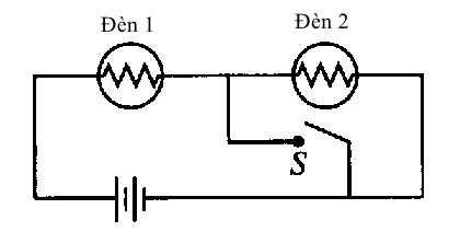 Mạch điện trong hình trên chứa hai bóng đèn giống hệt nhau mắc nối tiếp với một cục pin. Lúc đầu, cả hai bóng đèn đều sáng với độ sáng bằng nhau. Khi công tắc S đóng, hiện tượng nào sau đây xảy ra với bóng đèn?