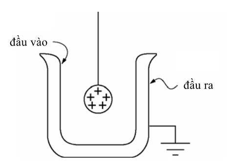 Một quả cầu nhỏ tích điện dương được hạ xuống bằng một sợi chỉ không dẫn điện vào một cốc kim loại được nối đất mà không chạm vào bề mặt bên trong của cốc, như minh họa ở trên. Dây nối đất gắn vào bề mặt bên ngoài được ngắt kết nối và sau đó quả cầu tích điện được lấy ra khỏi cốc. Câu nào sau đây mô tả tốt nhất sự phân bố điện tích dư thừa tiếp theo trên bề mặt cốc?