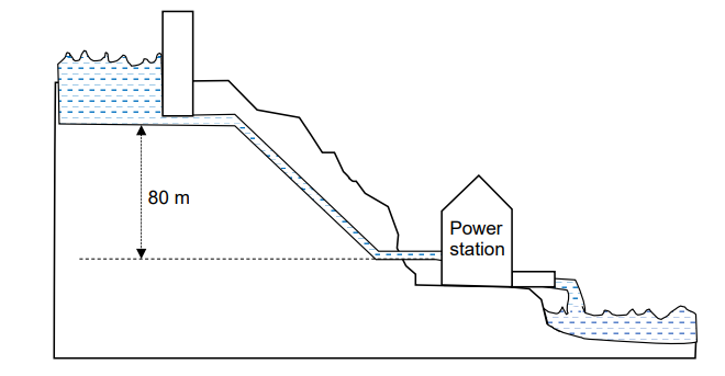 Nước được cung cấp từ một hồ chứa cao 80 m so với nhà máy điện. Nước chảy qua các tua bin của nó với tốc độ Q = 6m3/s. Giả sử rằng mật độ của nước là 1000kg/m3. Nếu hiệu suất của nhà máy điện là 60%, công suất của dòng nước được xác định bằng P = ρQgh, công suất điện đầu ra là:
