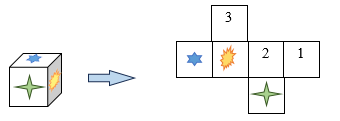 a) Các mặt đối diện của hình lập phương dưới đây có hình giống nhau. Ta cần hình gì ở các mặt được đánh số trong hình khai triển.